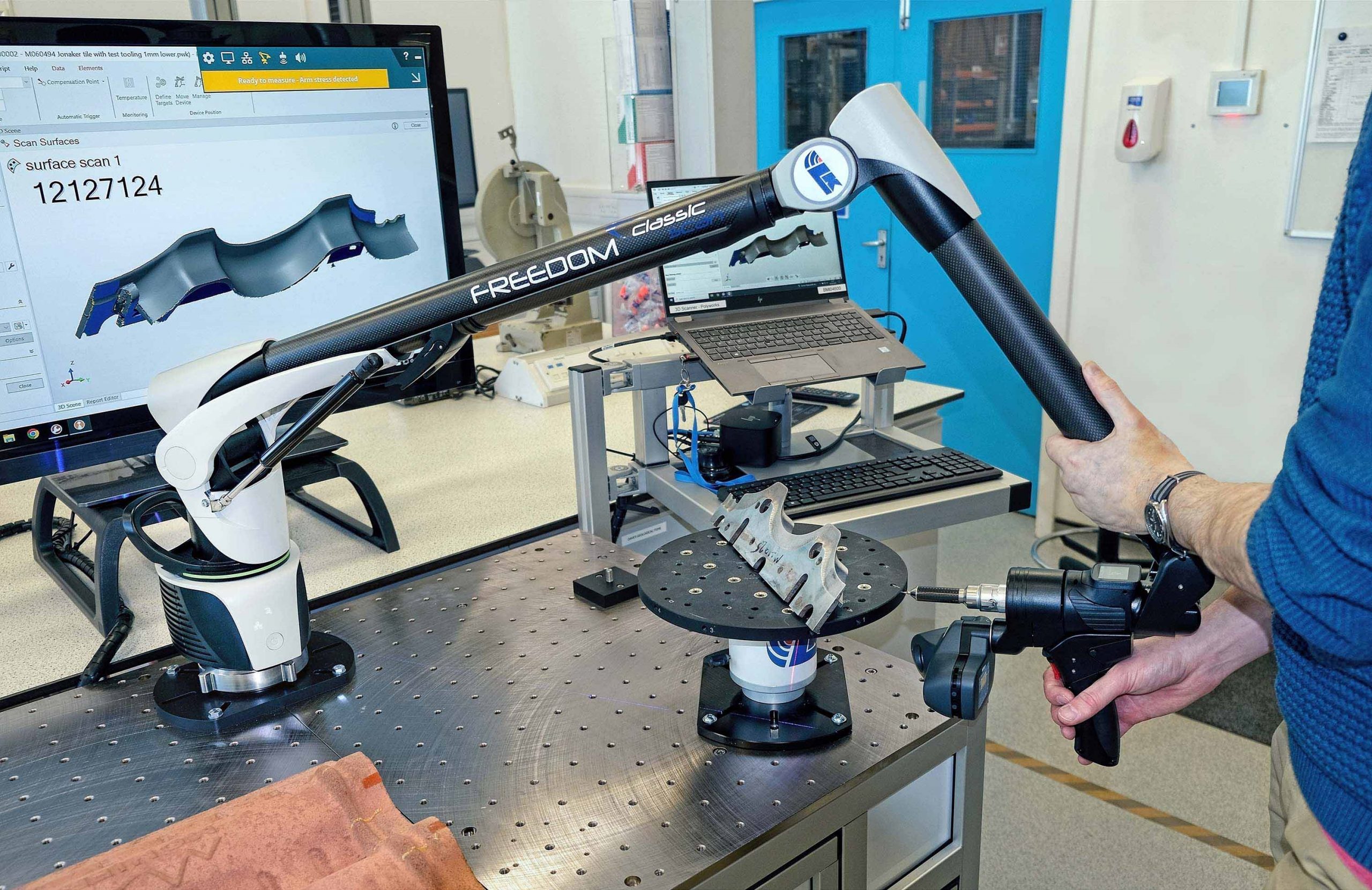 This is the scenario at the Crawley Technical Center of BMI Group, a leading manufacturer of flat and pitched roofing systems, where since July 2024 design engineer Luke Kelly and several of the team have been using a portable measuring arm inspection solution supplied by LK Metrology. Superseding a smaller and now unsupported arm and touch probe, which was used alongside conventional, manually-intensive metrology equipment such as callipers and height gauges, the new inspection technology comprises a 7-axis, multi-sensor FREEDOM Arm Classic Scan with a 2.73-metre reach equipped with a touch probe and an H120 laser line scanner, which since the end of 2023 has been manufactured by LK following its acquisition of Nikon Metrology’s laser scanner hardware and software business. Together with a rotatable, 300 mm diameter FREEDOM Index Table, the lightweight carbon fibre arm is mounted on a metrology table, all elements supplied by LK. Additionally, Innovmetric’s PolyWorks Inspector software was purchased to provide advanced point cloud analysis, evaluate surfaces, measure geometrical features, generate coloured heat maps for part-to-CAD or scan-to-scan comparisons, and generate full reports.
