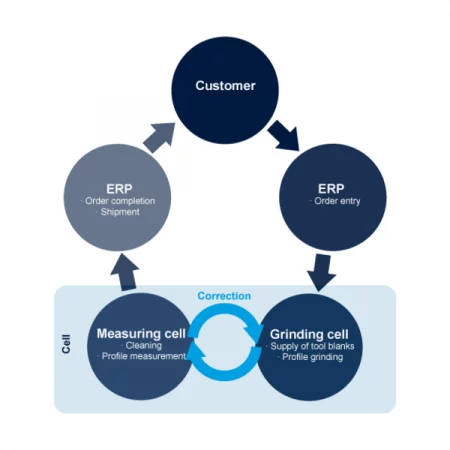 In the production cell, a robot feeds the grinding machine with tool blanks. A large parts warehouse allows for a wide variety of production without retooling. According to the grinding process, the first insert is cleaned and measured. If the profile is within the required tolerances, series production starts. If not, the grinding process is corrected fully automatically – usually, a single iteration is enough to grind a perfect profile. This closed-loop process achieves maximum accuracy and cost-effectiveness from a batch size of just one. The inspected panels are then automatically packed and dispatched. At the same time, the system documents all relevant data – including a test report of each panel for the customer.