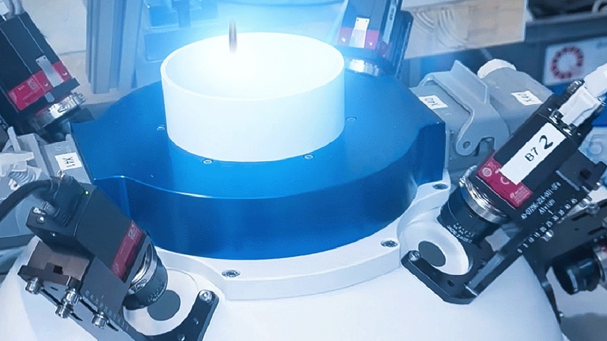 A component feeder developed by the manufacturer transports the individual parts, which are up to 40 mm in size, from the punching machine into a test sphere without any further handling. As the parts fall through the sphere, they are captured from different perspectives by 16 high-resolution cameras. The objects are captured without shadows or reflections due to an indirect LED flash illumination. The measurement data is checked against the nominal CAD model so that defective parts can be ejected immediately. The high processing rate for this computationally intensive analysis is achieved by fast inspection algorithms, parallelized camera control and several evaluation computers. During test operation, defective parts with geometric deviations in the range of 100 micrometers were reliably identified. The measurements were verified on a random basis using CT scans.