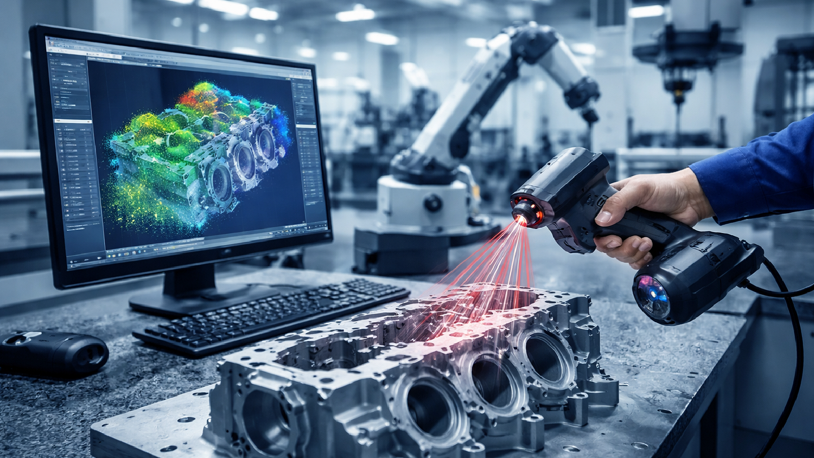 Manufacturers implement automated scanning cells where robotic arms equipped with laser scanners traverse the part, collecting point clouds with minimal human intervention. Conveyor-based systems allow parts to pass under fixed scanners for rapid, continuous inspection. Hybrid approaches combine tactile CMM probes for critical dimensions with point cloud scans for complex surfaces, ensuring full coverage without sacrificing precision. Inline inspection enables immediate defect detection and feedback, reduces scrap and rework, and allows continuous monitoring of process consistency.
