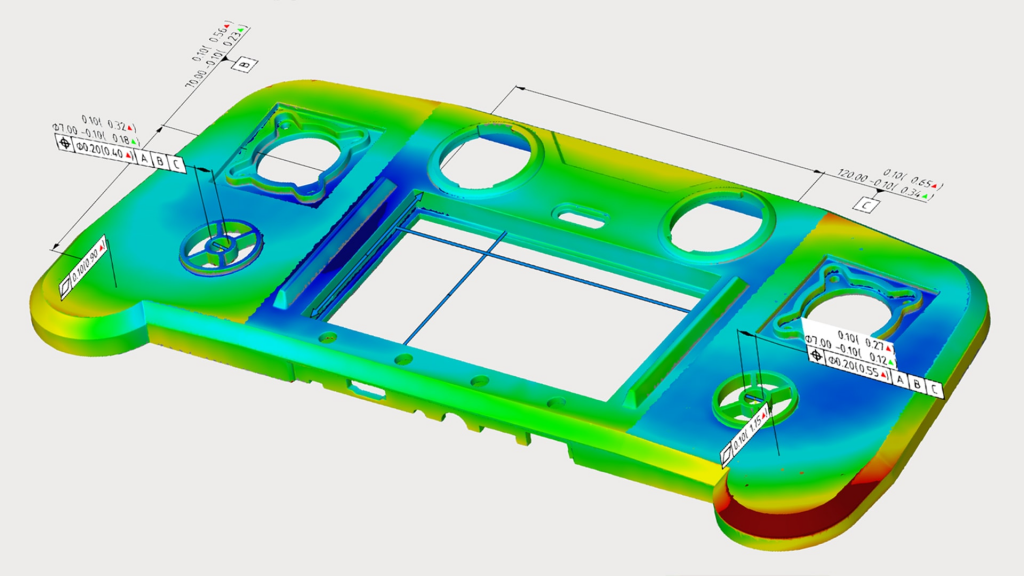 Both GD&T and the measuring results of the tolerance check are expressed as pure numerical values. However, interpreting these numbers and translating them into specific corrective actions is a challenge: The numbers contain neither information on the orientation in which the inspected part element may need to be corrected nor what quantity of material must be removed or added at which location. They merely reflect the width or diameter of the computed tolerance zone. For this reason, graphical representation methods, e. g., in the form of deviation flags, have been established to visually identify the type and form of deviations. These can also be supported by indicating deviations in individual axes. GD&T is most easily inspected using software that color-codes nominal and actual values and uses vectors to represent deviations.