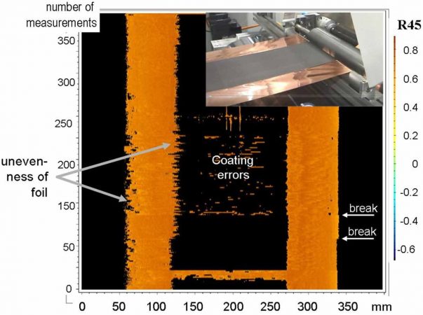 The system was tested on PEDOT layers on PET foil (organic electronics, transparent electrode manufacturing) and battery electrolyte coatings on copper foil. In both cases it delivered quantitative thickness maps at production speed. Critically, polarimetric sensitivity reveals coating uniformity deviations, edge anomalies, and surface defects invisible to conventional optical inspection with direct implications for yield improvement and early defect rejection.