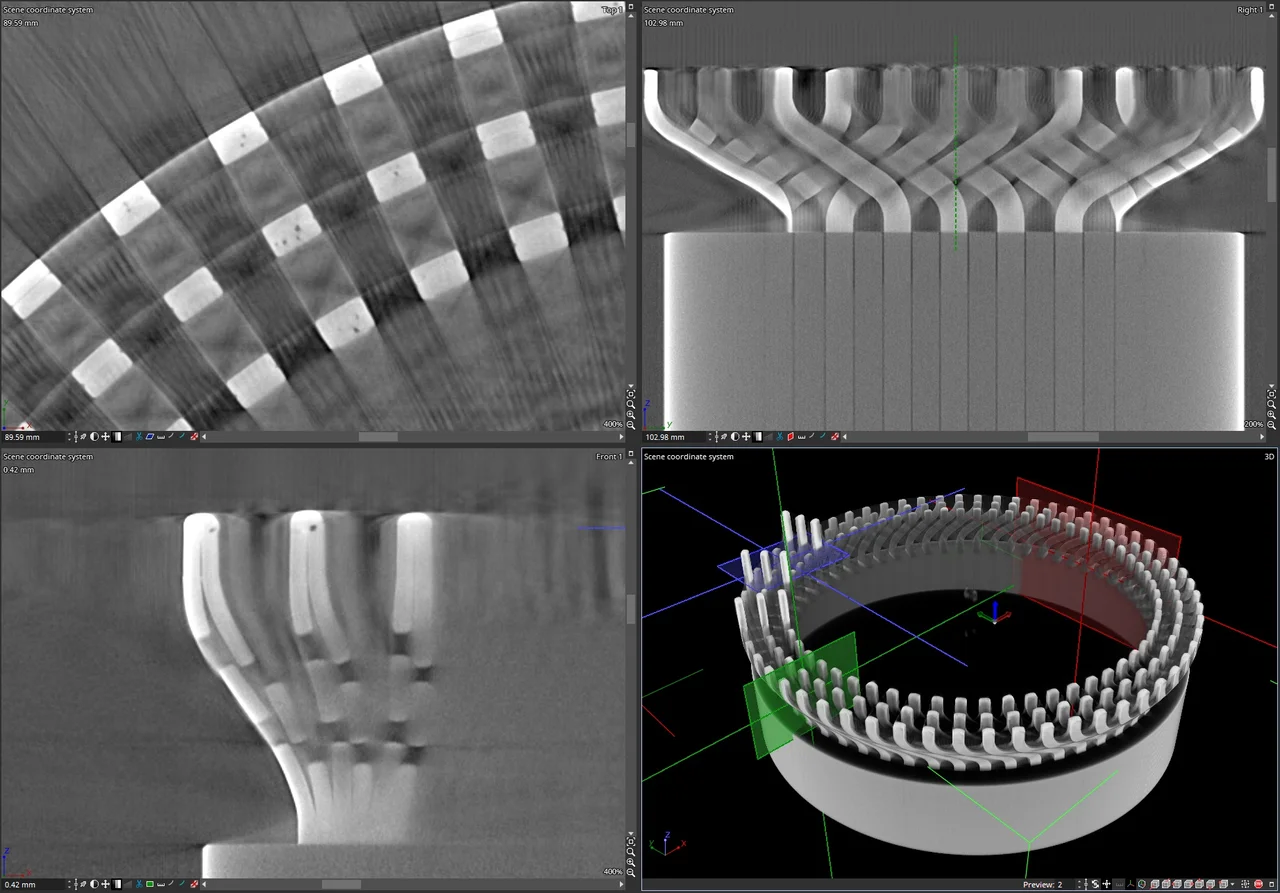 When internal features or hidden joining quality must be assessed, Hexagon contributes through its CT analysis and metrology software VGSTUDIO MAX. Used in conjunction with industrial CT scanning hardware from specialist OEMs, VGSTUDIO MAX enables volumetric visualization, CAD comparison, dimensional measurement, and defect analysis of hairpin stator assemblies. This includes evaluation of laser-welded hairpin joints, internal conductor alignment, insulation coverage, and porosity, all without destructive sectioning.
