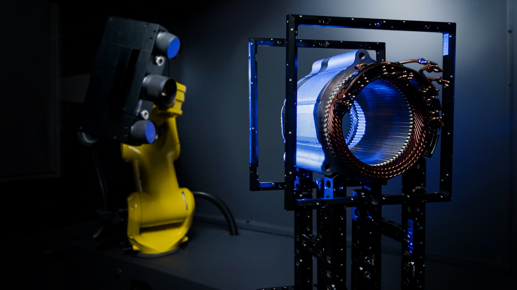 ZEISS has emerged as a leader in 3D optical and multisensor inspection solutions tailored to EV motor manufacturing. At the heart of its portfolio is the ZEISS ScanBox 4105 for eMotors, a dedicated system for automated 3D digitization and dimensional inspection of full hairpin stator assemblies, individual hairpins, or batches of hairpins. Using the ATOS Q for eMotors blue-light sensor, ScanBox captures highly detailed point clouds that form the basis of a digital twin – enabling manufacturers to detect deviations from CAD models, analyze form and position tolerances, and assess features such as bending points, radii, and leg lengths.