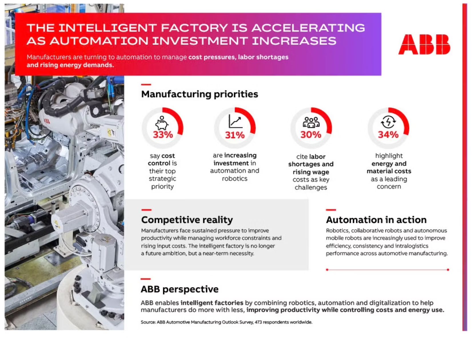“The intelligent factory is no longer a future ambition – it has become essential for manufacturers looking to stay competitive in a challenging and fast-moving environment,” said Joerg Reger, Managing Director of ABB Robotics Automotive Business Line. “This year’s survey shows that automation, particularly more autonomous and versatile robotics (AVRTM), are increasingly viewed as a practical, near-term solution to cost pressures, labor availability and energy efficiency challenges.”