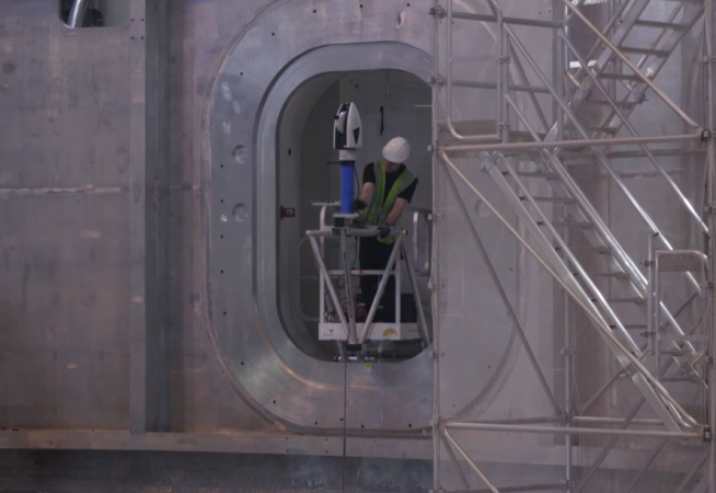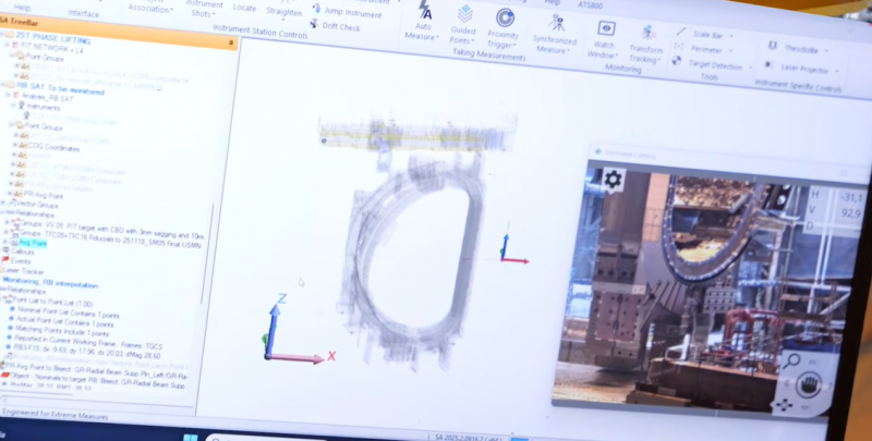 Reflective targets installed on the module played a key role in guiding the operation. Working in tandem, laser trackers and total stations captured real-time 3D positional data, allowing engineers to assess the relationship between the module’s current coordinates and the Tokamak pit’s reference frame.