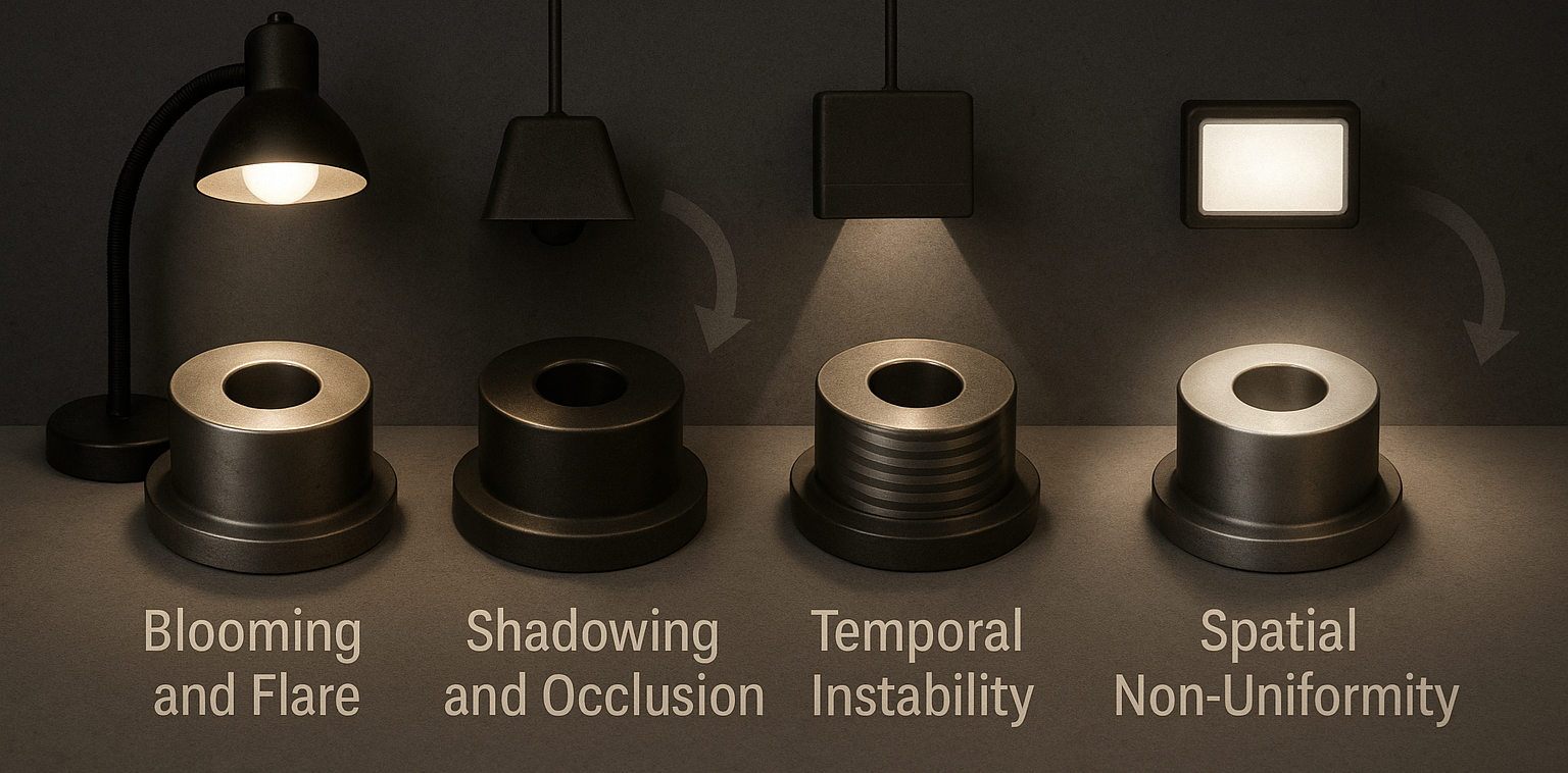 Illumination defines contrast; contrast defines the apparent edge; the edge defines the measurement. Small lighting faults therefore become dimensional bias: