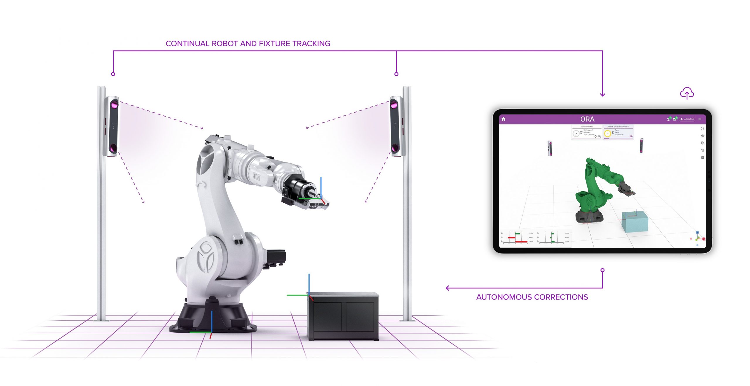 Measurement sensors gather all positional data from a robot cell, which is transferred to ORA and compared to the desired activity specification. A digital twin is shown in the user interface to accurately represent activity, allowing users to view frames and their associated CAD models in real time. Deviations in robot activity are identified, with positional revisions fed back to the robots, allowing for corrections to be made in-process, thereby avoiding production errors.