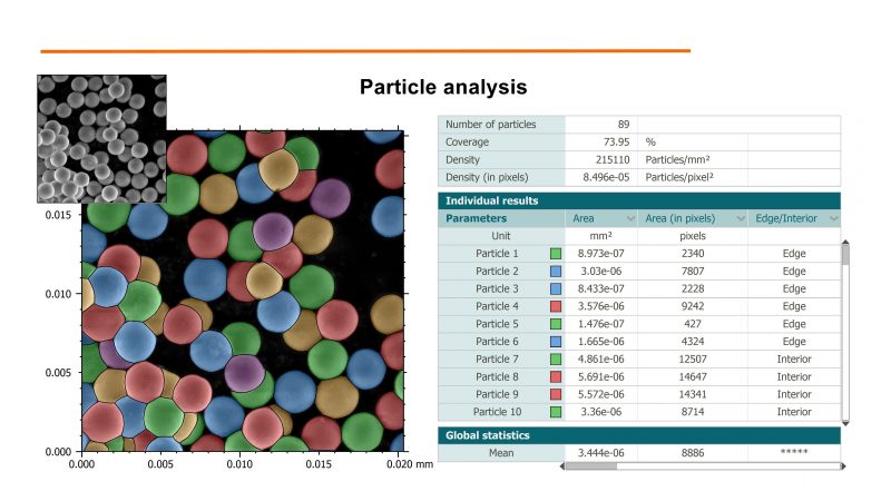 Explore Particles: Detect, quantify and measure particles, pores, or grains with precision. The module offers multiple segmentation methods, including thresholding and watershed, to overcome challenges in particle dispersion or sample preparation.