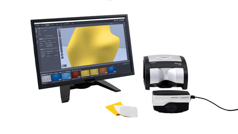 The Rhopoint PANTORA Aesthetix is a dual HDR camera-based surface characterization system that quantifies gloss, haze, roughness, and surface structure at 110 pixels per millimeter. It can reconstruct detailed 3D topography and integrates with X-Rite’s PANTORA Appearance Software, allowing users to manage, edit, and share digital materials using the vendor-neutral Appearance Exchange Format (AxF).